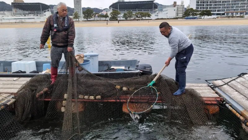 これまで実証実験として取り組んできましたが、今年からは養殖場所を移動し、本格的に始動。正式なライセンスも取得し、さらなる生産拡大に向けて動き出しています。ここでは水深5mの生け簀で本格的な養殖が行われています。