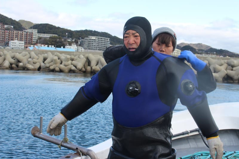 漁期は12月から4月までの許認可制。潜り手には船上からエアホースで空気が送られ、そのホースはまさに“命綱”。