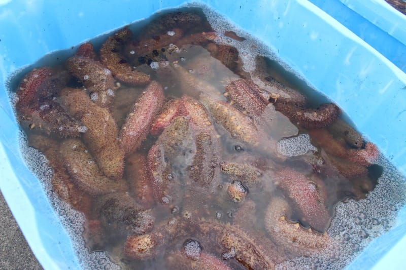 水揚げされたなまこは「ドマル」と呼ばれる黒いカゴに入れ、海中に沈めて泥や砂を吐かせます。これにより臭みが抜け、身が引き締まった高品質な状態へと仕上がります。